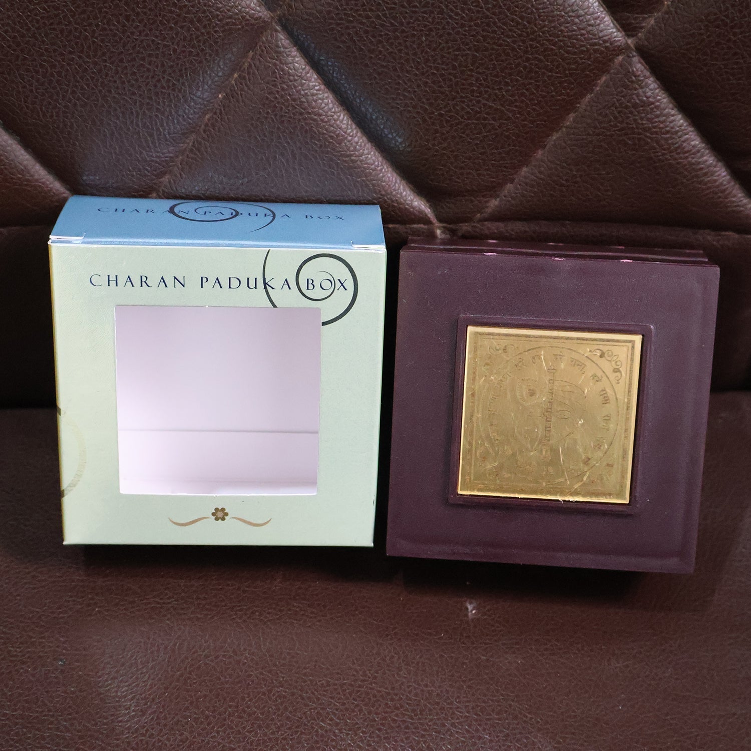 Material: Wooden box with gold-plated Charan Paduka & embossed metal art